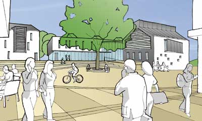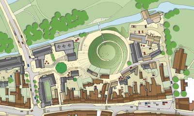 | Moat Lane, Towcester The masterplan for the land around the Bury Mount accommodates a new civic building, a food store and apartments for retirement living. The scheme also proposes the conversion of two old mill structures into a boutique hotel and a micro brewery respectively. |