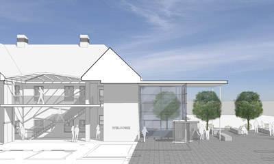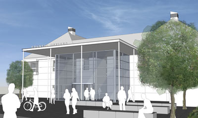 | District Council Offices Leicestershire The concept design illustrates the regeneration benefits and potential opportunities for the existing property portfolio. The scheme includes a new entrance lobby under a prominent canopy, a new public piazza and re-using an existing light well to create a new entrance atrium. |