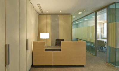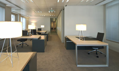 | 110 Wigmore Street London The refurbished office overlooks the corner of Wigmore and Duke Street. The narrow and awkward footprint is rationalised by a full length storage wall along the inner core, which is clad in leather and complemented with a distinguished selection of executive furniture pieces. |